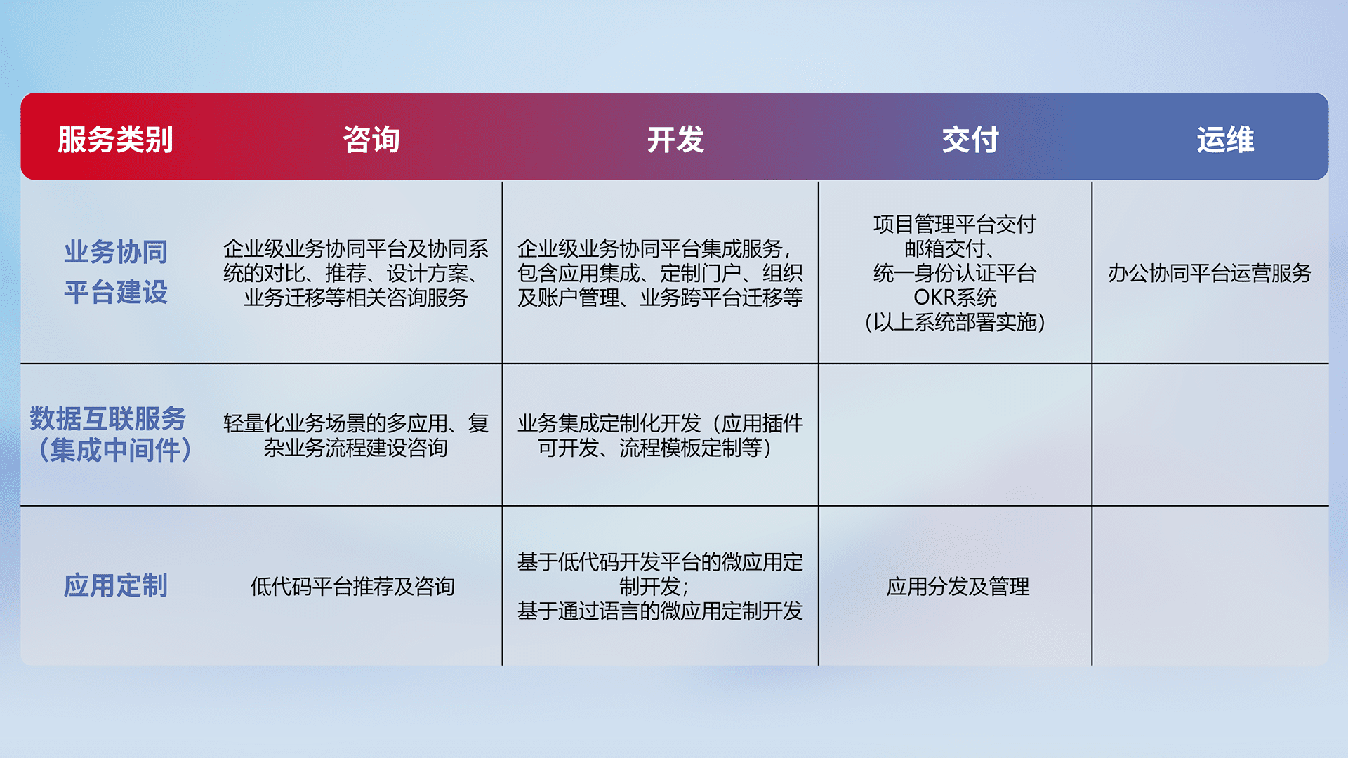 针对钉钉、、企微、、IDaas等平台级产品提供产品的规划、、、方案、、、、交付、、定制化开发等服务,,实现如统一协同办公、、、智能客户服务、、混合会议管理、、智能数据查询、、、等业务场景,,,实现数字化转型。。。。