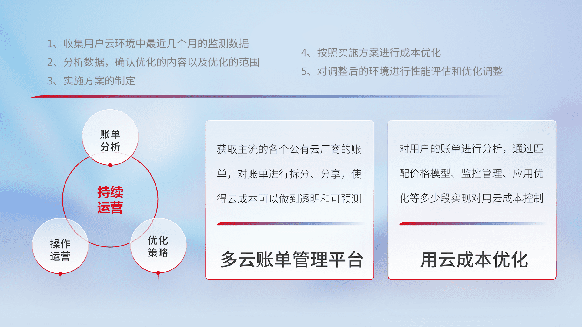 通过多云纳管,,,以统一的资源数据模型把客户的云资源进行抽象和封装,,,进而实现对多云资源的统一操作,,保障云资源管理的可靠性、、、稳定性与可用性。。。。量身定制化运维内容,,配置、、、、开发运维、、、补丁管理、、、、备份、、监控、、认证和访问管理、、审计和日常巡检等,,,,保障在用云过程中的可靠度,,,,稳定度以及高可用率。。